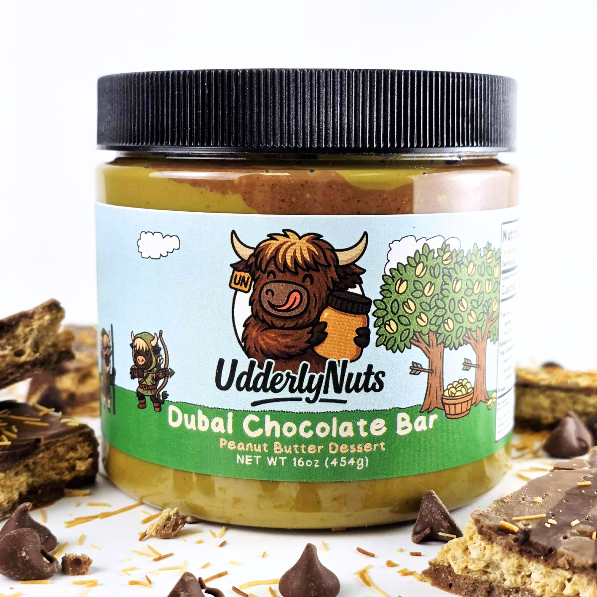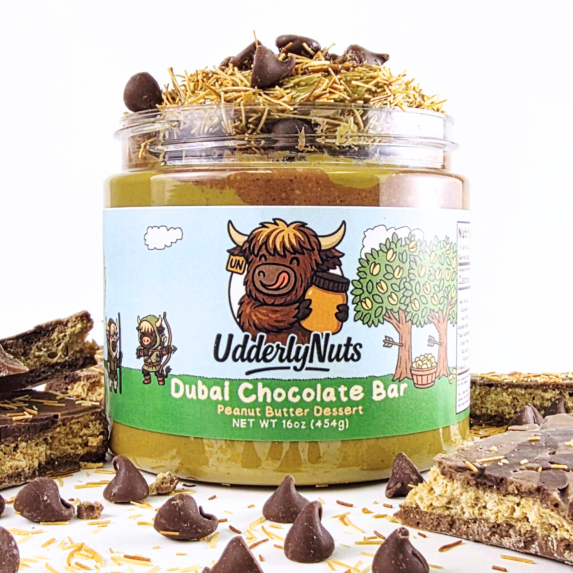 Dive into the viral Dubai Chocolate Bar peanut butter, where creamy milk chocolate meets swirls of peanut butter, dreamy pistachio cream, and crunchy kataifi - topped with milk chocolate chips.