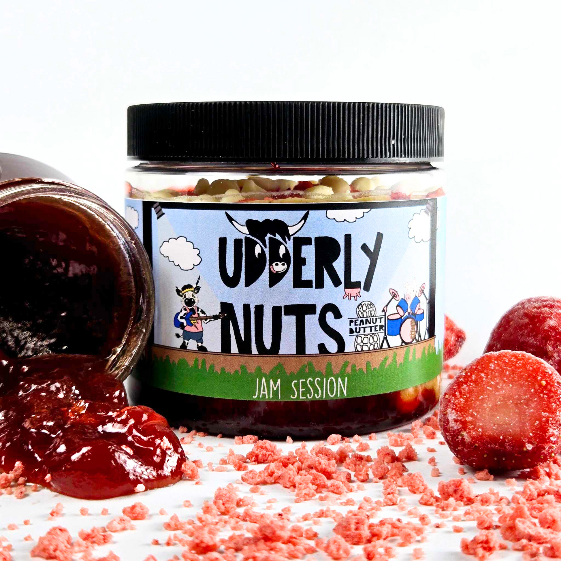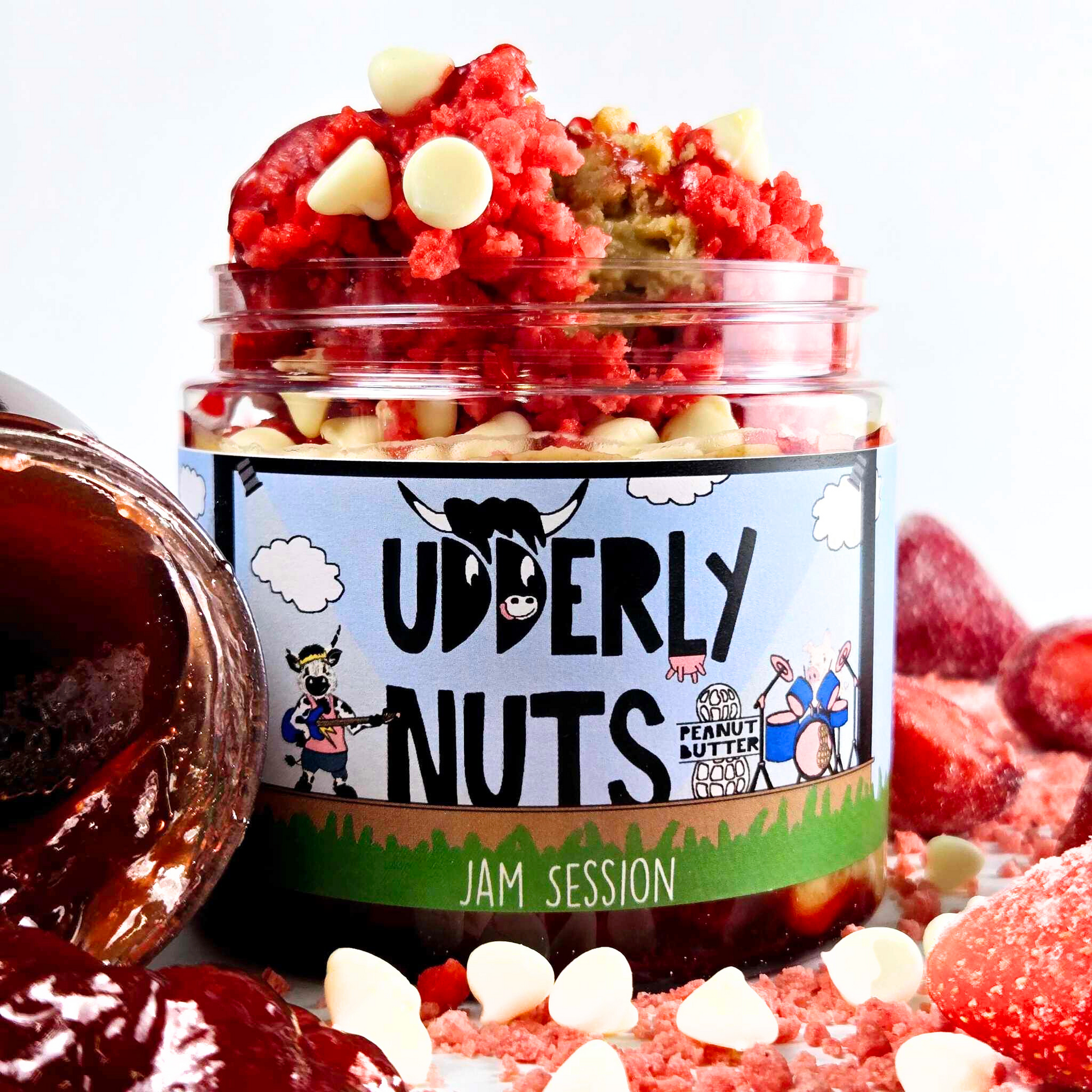 Sweet white chocolate peanut butter layered on strawberry topping, white chocolate chips, and Strawberry Krunch bits.