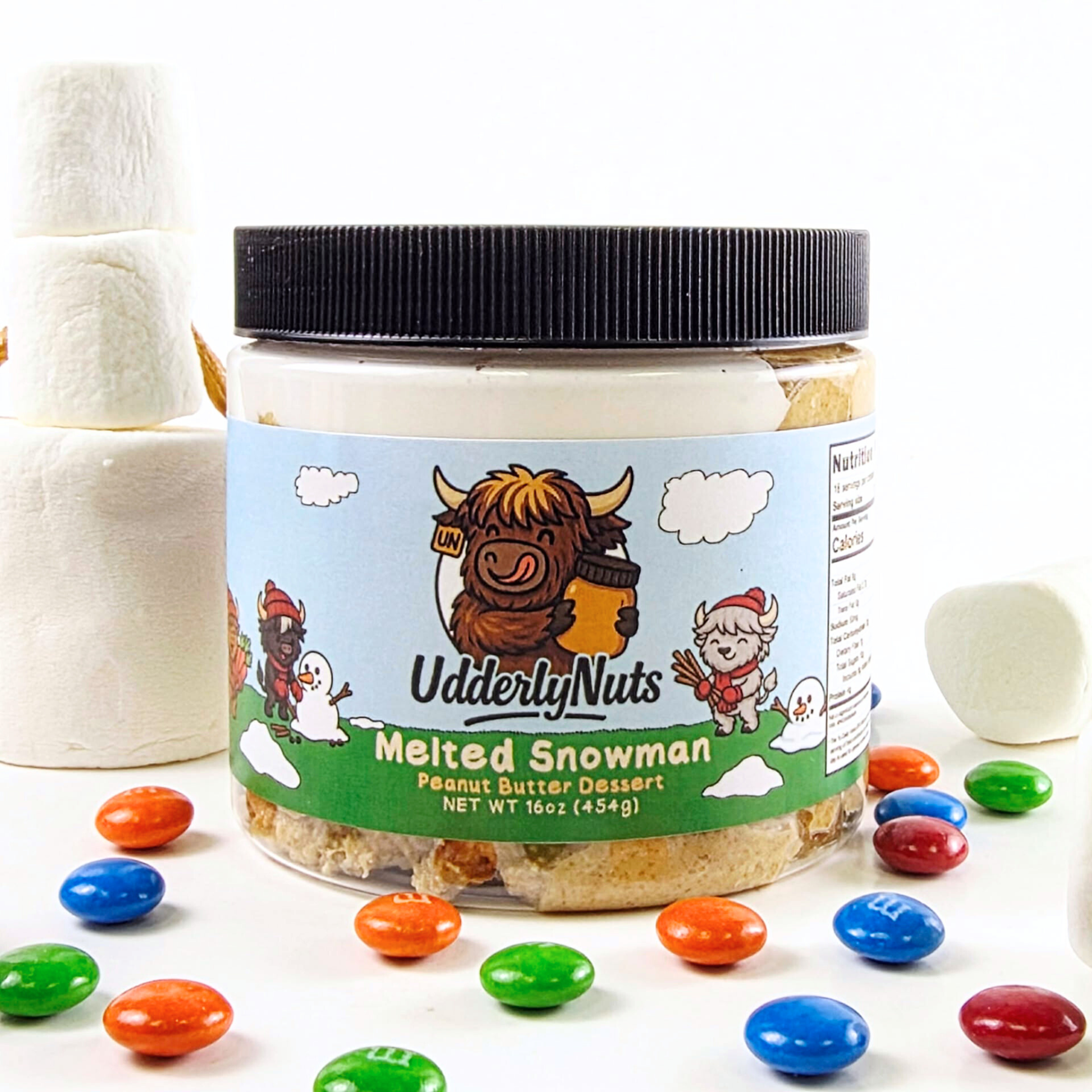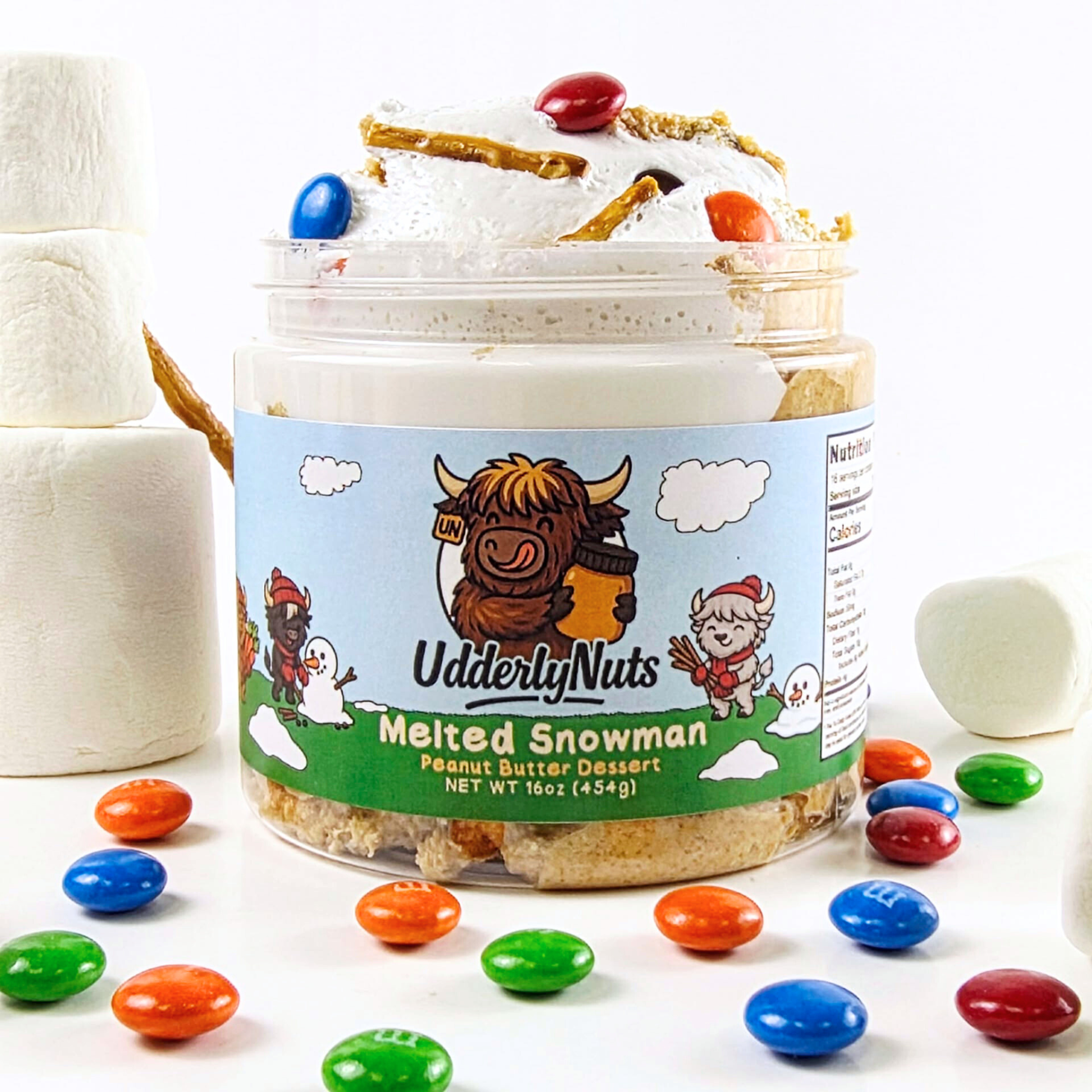 Say hello to Melted Snowman—a whimsical jar of pure winter fun! This playful creation features our white chocolate peanut butter swirled together with marshmallow fluff, crunchy pretzels, and rainbow coated chocolate candies.