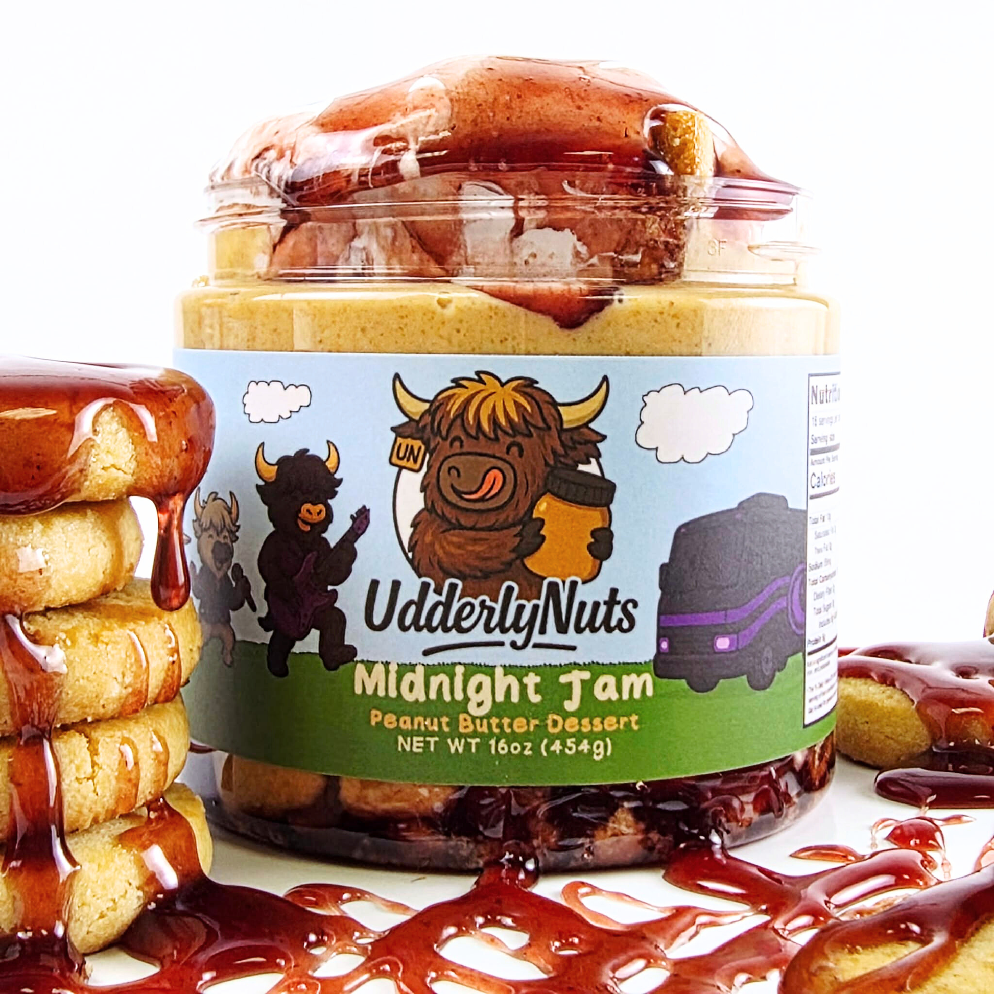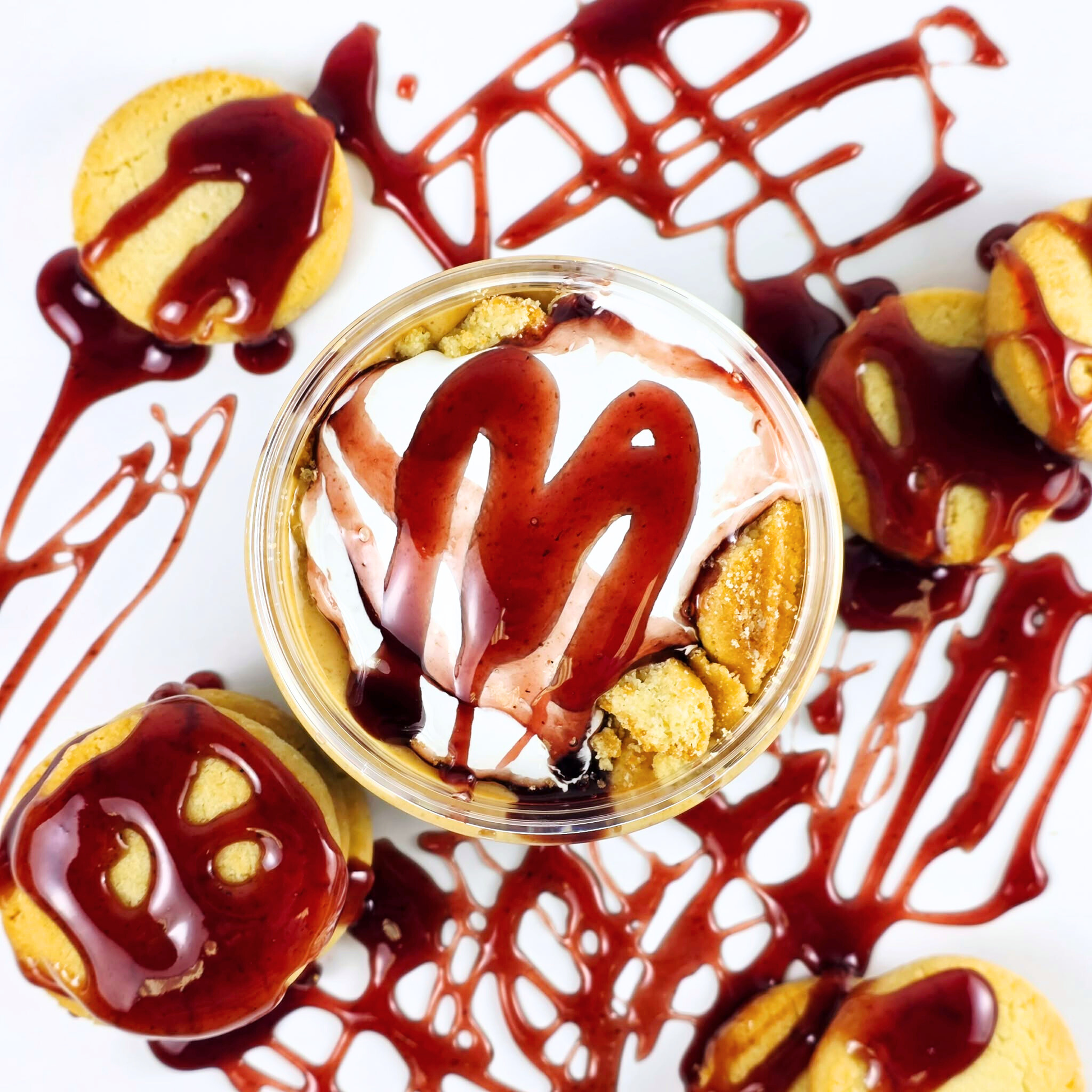 Indulge in Midnight Jam, a decadent blend of white chocolate peanut butter swirled with luscious blackberry sauce. Each bite offers a perfect balance of sweet and tangy, enhanced by marshmallow fluff and the satisfying crunch of buttery shortbread cookies.